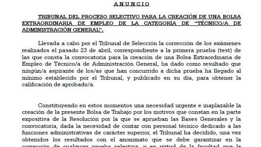Aunque en este último anuncio se alude a la existencia de “una necesidad urgente e inaplazable”de la creación de la bolsa de trabajo “por los motivos que constan en la parte expositiva de la resolución por la que se aprueban las Bases Generales y la convocatoria, dada la necesidad de contar con personal técnico dedicado a las funciones administrativas de carácter superior”, en aquellas bases se señala que el objetivo de la convocatoria es “para atender las necesidades que pudieran surgir en la corporación”.