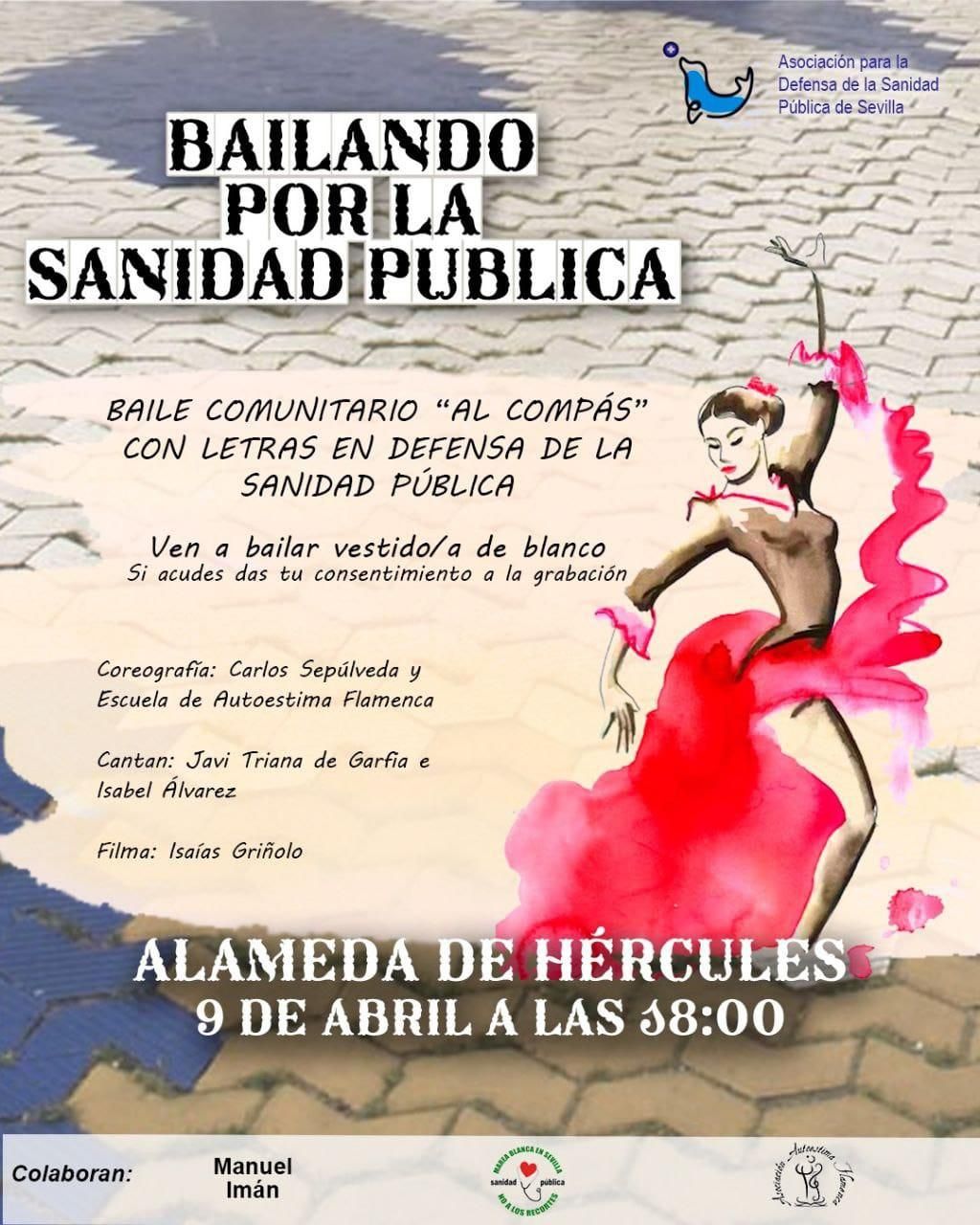 En segundo lugar se realizará un 'Baile comunitario por sevillanas en defensa de la sanidad pública' en el que los organizadores invitan a la ciudadanía a participar en el mismo con el conocimiento de si se acude se da el consentimiento a formar parte en la grabación que recogerá la organización.