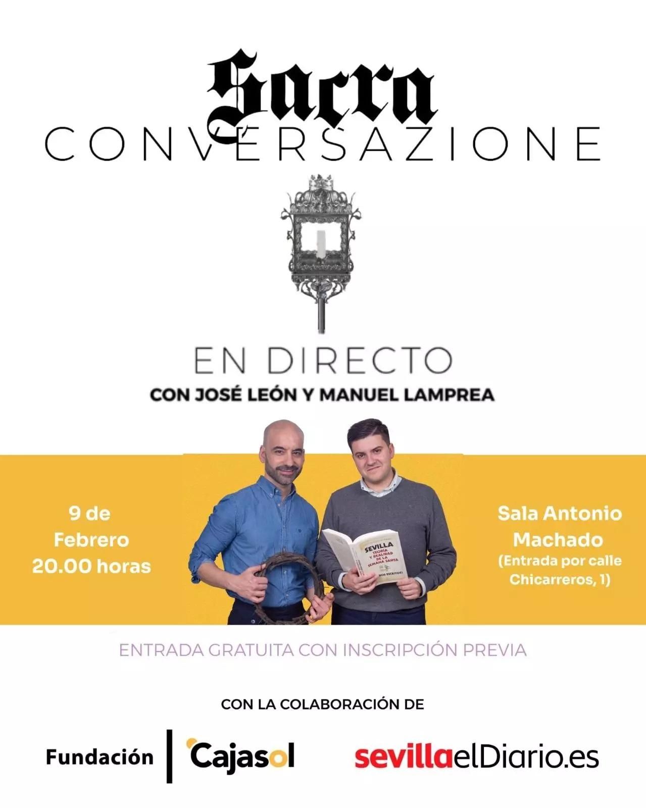 “Nos vemos como muy tarde el lunes 9, con muy buena compañía, con la de nuestros oyentes”. Un intercambio de audios entre el historiador de arte José León y el periodista Manu Lamprea sirve de excusa para que los autores calienten motores de cara a la grabación de lo que va a ser el episodio en directo y con público que inaugura la tercera temporada del pódcast 'Sacra Conversazione'. Ambos se reencontrarán con sus oyentes el próximo 9 de febrero, a partir de las 20.00, en la Sala Antonio Machado de la Fundación Cajasol. La entrada es gratuita, previa inscripción en este enlace.
