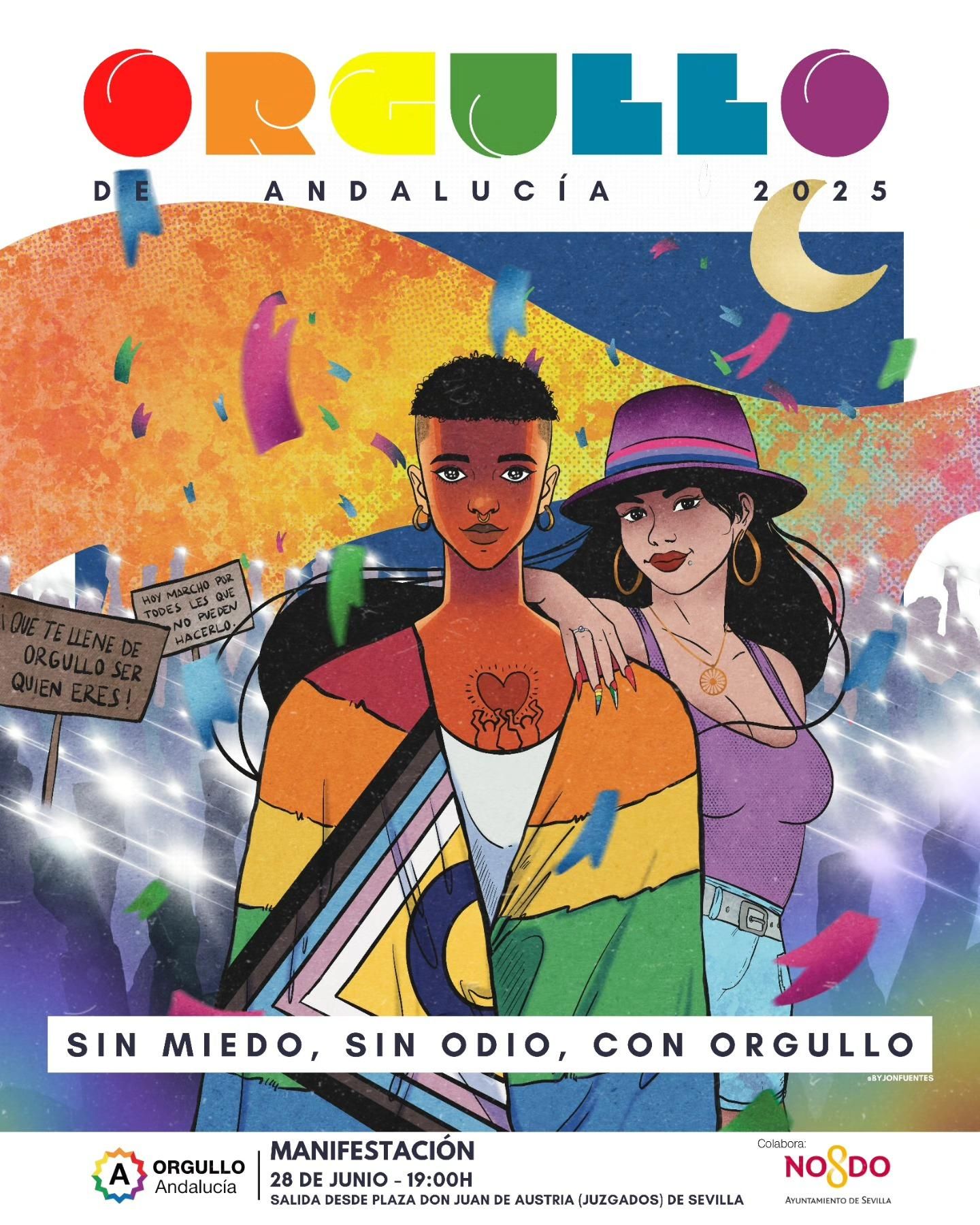 Bajo el lema “Sin miedo, sin odio, con orgullo”, “este año salimos a las calles para celebrar nuestras identidades, defender nuestros derechos y alzar la voz por quienes aún no pueden hacerlo”, dice la organización. El cartel de este año, obra del artista andaluz @byjonfuentes, “es un canto visual a la diversidad, la lucha y el amor propio. Un homenaje a todas las personas que construyen cada día una Andalucía más libre, más justa, más orgullosa”.