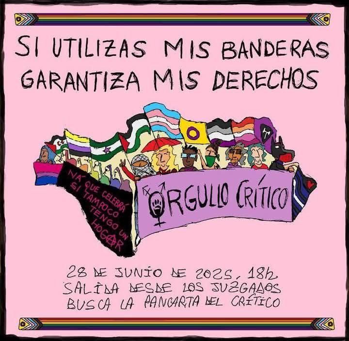 El 'Orgullo Crítico Sevilla' participará en la mencionada marcha con manifiesto, cartel y pancarta propias bajo el lema 'Si utilizas mis banderas, garantiza mis derechos'. “Este 28 de junio no celebramos un orgullo capitalizado, comercial y vacío. Salimos a la calle con memoria, rabia y dignidad. Porque nuestros derechos siguen siendo papel mojado mientras se recortan leyes, se niega la identidad de las personas trans, intersex y no binarias, y se permiten discursos de odio desde las instituciones”, apuntan.