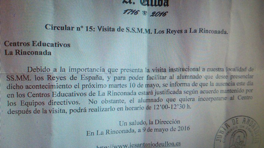 “Debido a la importancia que presenta la visita institucional a nuestra localidad de sus majestades los Reyes de España, y para poder facilitar al alumnado que desee presenciar dicho acontecimiento el próximo martes 10 de mayo, se informa de que la ausencia de este día en los centros educativos de La Rinconada estará justificada según acuerdo mantenido por los equipos directivos. No obstante, el alumnado que quiera incorporarse al centro después de la visita, podrá realizarlo en horario de 12,00 a 12,30 horas”, según figura en una circular del Instituto de Educación Secundaria Antonio de Ulloa.