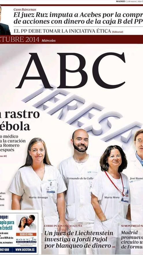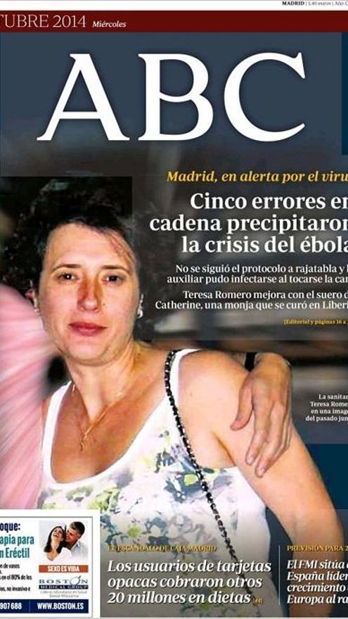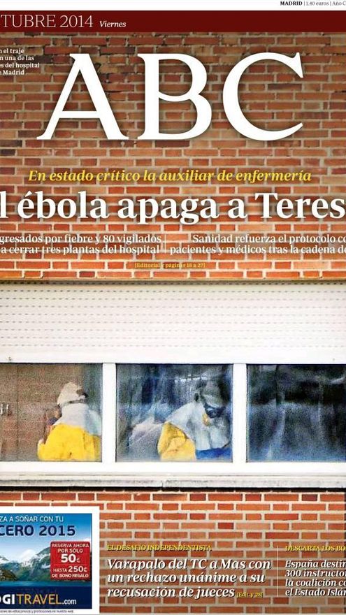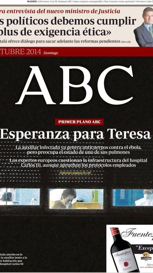 El estado de Teresa Romero mejora al día siguiente. En portada aparece una foto de Romero en el interior de la habitación en una de las decisiones más polémicas y contestadas de algunos medios de comunicación en esta crisis. Las opiniones negativas de algunos expertos europeos sobre las condiciones del hospital Carlos III para afrontar esta crisis son compensadas con un “pero aprueban los protocolos”, que se han convertido en la principal, quizá única, línea de defensa del Gobierno.