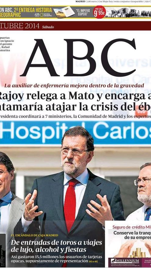 Ante la evidencia de los errores de los responsables del Ministerio de Sanidad y de la Consejería de Sanidad de Madrid, el Gobierno tiene que tomar decisiones, es decir, rectificar. En portada, es Rajoy el que lleva la iniciativa, como si hasta ahora no se hubiera preocupado por el tema. Ahora es labor de la vicepresidenta del Gobierno “atajar la crisis del ébola”.