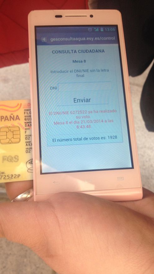 Ella nos explica que el sistema de votación es 100% fiable y seguro. Se ha utilizado el censo electoral de las últimas elecciones municipales de 2011 y todas las mesas tienen un sistema informatizado conectado por internet que se actualiza con cada votación. “Es imposible que una persona vote dos veces porque una vez que introduces un DNI ya queda registrado y no puede volver a hacerlo”, garantiza enseñándonos el sistema que no le permite introducir su DNI por segunda vez. Y nos explica esto, cuenta, porque “el alcalde ha ido diciendo que esta votación es de mentira y hay gente que vota dos veces y eso, como puedes ver, es totalmente imposible”.