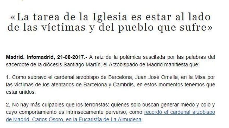 La Archidiócesis de Madrid ha respondido a Santiago Martín, cura y ex jefe de religión de ABC, que los únicos culpables de los atentados terroristas de Catalunya que han acabado con la vida de 15 personas son los terroristas. Martín utilizó los ataques terroristas de la Rambla y Cambrils durante su misa del domingo para cargar contra las alcaldesas de Madrid y Barcelona, Manuela Carmena y Ada Colau.