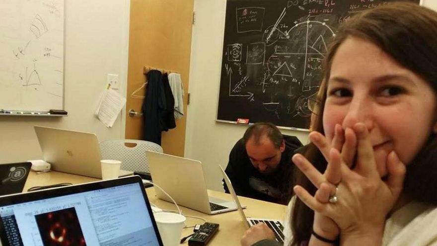 La figura de Bouman, de 29 años, no saltó a la luz hasta horas después del anuncio oficial, cuando empezó a circular una fotografía suya en redes sociales. En la foto, esta investigadora aparece emocionada junto a una pantalla de ordenador en la que se ve un anillo de luz con un centro oscuro. Su emoción estaba más que justificada. El algoritmo que había ayudado a crear funcionaba y la prueba era aquella imagen, la primera real de un agujero negro.