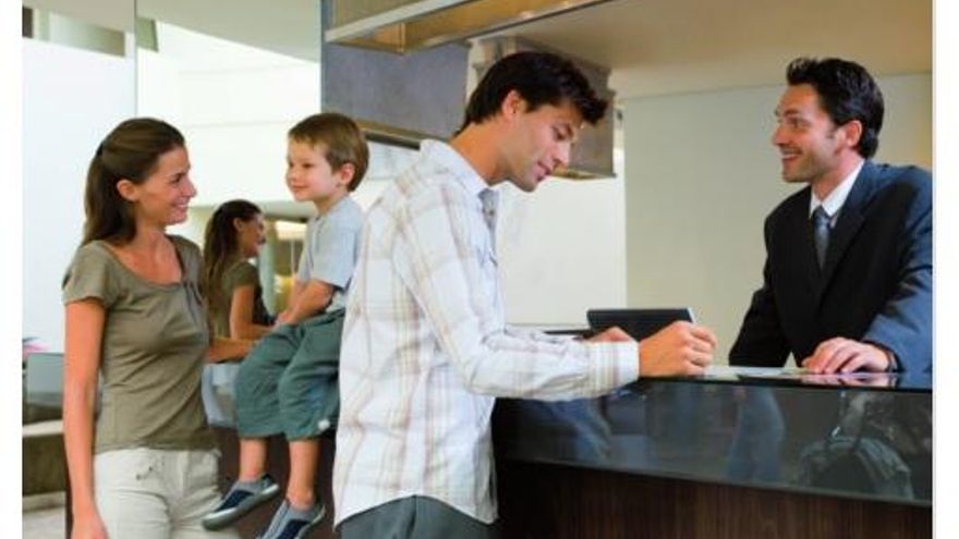 En el panfleto puede verse a una familia que parece acabar de llegar a un hotel. Mientras el hombre rellena papeles, la mujer atiende a los niños. También hay imágenes de una mujer con bolsas de compras, otra con delantal y a un hombre con traje y corbata dando la mano.