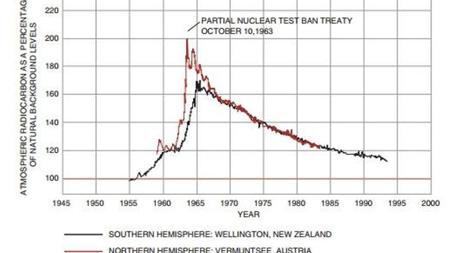 Los propios responsables de la aparición de ese exceso de carbono 14 que ha servido a los investigadores suecos para comprobar la capacidad de generar neuronas del cerebro, fueron los primeros que empezaron a analizar su presencia en la atmósfera. Según explica el historiador de la Universidad de Míchigan Paul Edwards, el carbono radiactivo inyectado por los tests nucleares en la atmósfera se convirtió en la primera manera efectiva para seguir el camino que seguían determinadas corrientes de aire a grandes altitudes.