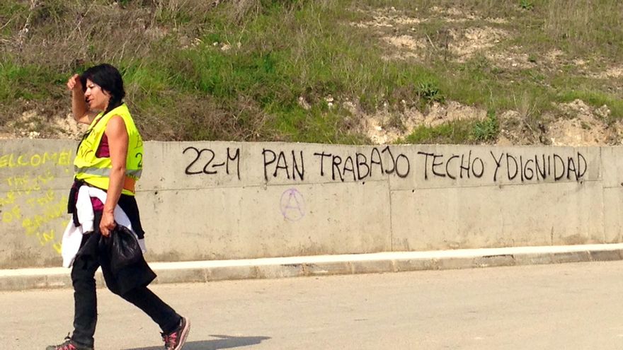 “Todos estamos afectados por los recortes y el desempleo. Y quienes no están afectados directamente, tienen familiares o amigos afectados. Por eso no podemos permanecer indiferentes. Merecemos pan, techo y trabajo”, dice una joven de Alicante que se suma a la conversación mientras subimos un pequeño montículo, siguiendo el trazo de una vía de servicio paralela a la autovía, flanqueados por miembros de la Guardia Civil.