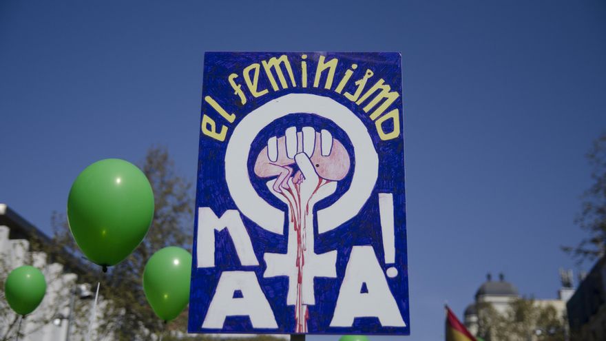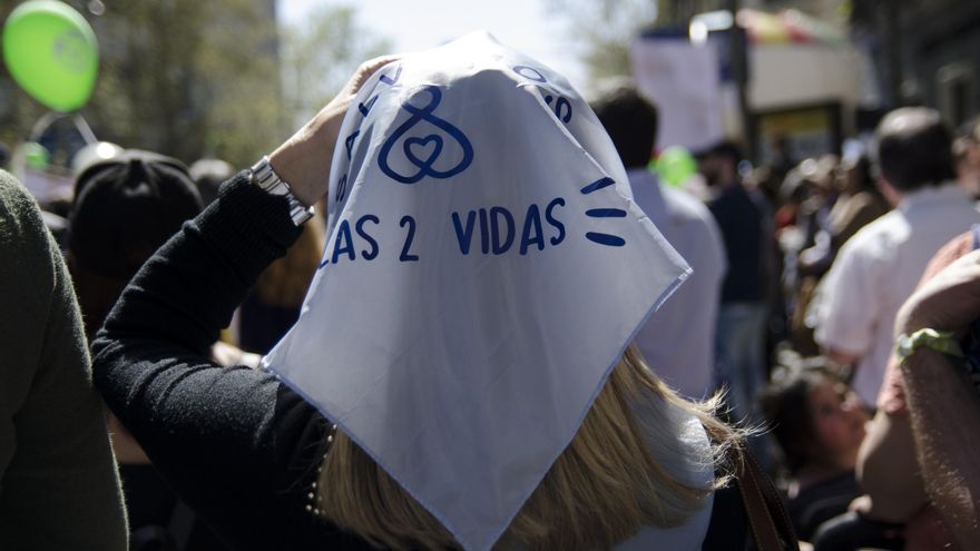 A petición de la organización, no hay banderas ni símbolos partidistas. Ondea alguna bandera española, pero la imagen general es de color verde. Paradójicamente, el color que en Argentina se usa para reivindicar la legalización del aborto. Algunas asistentes llevan un pañuelo azul con el eslogan “salvemos las dos vidas”, que es el empleado en las manifestaciones antiabortistas del país latinoamericano.