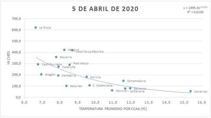 Fernando Belda, portavoz de Aemet y uno de los implicados en el proyecto, explica a eldiario.es que “es esperanzador, pero a la temperatura ahora le vamos a sumar otras variables, como la humedad o la contaminación”. También irán al detalle de provincias y de ciudad por ciudad, ya que dentro de la misma comunidad hay diferencias climatológicas. Para el estudio se cogió la temperatura media de 14 días y se comparó con los nuevos contagios acumulados en esos 14 días. Los datos del estudio reflejan que comunidades como Canarias, Baleares o Andalucía, con temperaturas de más de 12 grados, tuvieron el menor número de contagios notificados (al margen de los asintomáticos o sin diagnosticar, que habrá que incluir cuando se conozcan y que podrían variar el resultado del estudio). Por el contrario, Madrid, La Rioja, Castilla y León o Navarra, con temperaturas de entre 7 y 8 grados lideraron el ranking de contagio.
