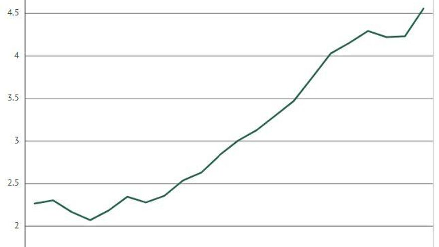 La siguiente gráfica recuerda a la evolución de la pandemia en muchos lugares. En realidad es el presupuesto que Corea del Sur ha dedicado a I+D desde 1996. Hoy es el país del mundo que invierte un mayor porcentaje de su PIB en ciencia: un 4,32% en 2018, según datos de 'R&D World'.