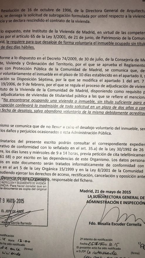 En junio de 2015, Alba (nombre ficticio) se levantó con una carta en la puerta que le obligaba, a ella y a sus dos hijos menores de edad, a abandonar la casa en la que llevaban viviendo toda su vida en un plazo de 10 días. El piso, propiedad de la Agencia de la Vivienda Social de Madrid, fue adjudicado a su abuelo en 1959 y se estuvo pagando al menos hasta que falleció en 1995. Ahora y tras varias negociaciones, la empresa pública de la Comunidad de Madrid ha extendido el ultimátum hasta el 7 de mayo. Las opciones que deja a la familia son comprar la casa por 54.000 euros o quedarse en régimen de alquiler social a cambio de 44,83 euros al mes, adaptado a su nivel de renta. Si no acepta ninguna de las dos opciones, se va a la calle.