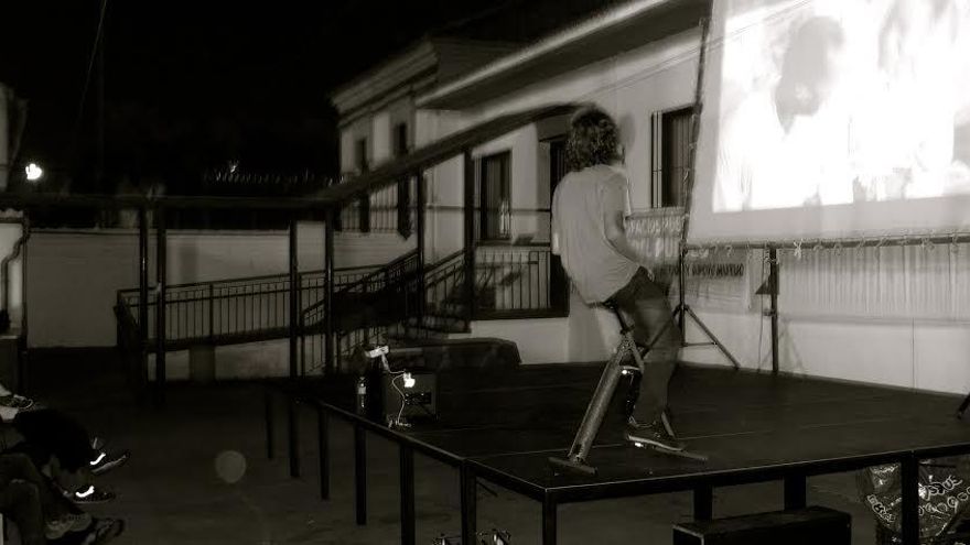 Algunas personas se acomodan detrás de la bicicleta estática esperando su turno para generar energía. Isabel y Carmelo, los creadores del proyecto Cinecicleta, han colocado un mueble delante del artilugio a pedales, pues se hace raro mover las piernas sin manillín al que agarrarse. Transcurre la película y cada diez minutos hay un relevo, alguien diferente se sube al sillín y empieza a pedalear mientras mira con un ojo la película y con el otro un indicador con números que hay que mantener constantes o la pantalla se fundirá a negro y el público chiflará y se quejará porque ahí no se ve ya nada. Pero eso no sucede y al terminar hay hasta aplausos.