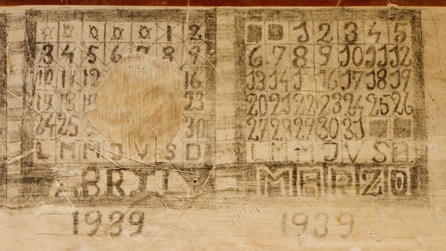 Un grupo de soldados camina hacia un avión de combate que se encuentra en pleno vuelo. Una línea atraviesa el mapa de España señalando el largo trayecto que llevó a un prisionero desde Barcelona hasta la pequeña localidad pontevedresa de Oia. Una cabeza de cerdo sobre una bandeja parece insinuar el deseo de enfrentarse a un monumental banquete. Un calendario de mayo de 1939 con los días tachados bajo un texto que reza: “Mes de la libertad”. Una frase en la que se lee: “Aquí llegó el día 12-2-39 Eugenio Blanco”. La frase la completa un compañero de cautiverio con una letra bien diferente: “Aquí llegó el día 12-2-39 Eugenio Blanco y salió pal sementerio el día 16-4-39”.