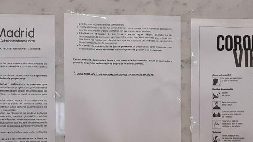 La rápida expansión de la COVID-19 llevó al Colegio Profesional de Administradores de Fincas de Madrid (CAFMadrid) a enviar a todas las comunidades de propietarios una serie de instrucciones para evitar el contagio del coronavirus. En el documento distribuido a todos los inmuebles se recomendaba, entre otras cosas, “mantener una distancia de contacto de al menos un metro entre las personas que transitan en las zonas comunes” o “extremar la limpieza diaria con geles desinfectantes, lejía u otros materiales no abrasivos en las zonas más sensibles”. También “utilizar el ascensor individualmente para evitar contactos con otros vecinos”, o que el portero, al igual que el resto de residentes, se mantuviera “en la vivienda-portería con sus familiares, saliendo a hacer una ronda de control cada cierto tiempo”.