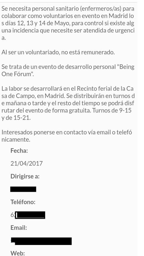 El foro Beingone, organizado por una empresa española, previsto para los próximos 12 al 14 de mayo en Madrid, colgó una anunció en el tablón telemático del Colegio de Enfermería en el que se leía: “Se necesita personal sanitario (enfermeros/enfermeras) para colaborar como voluntarios”. Y añadía que “al ser un voluntario no está remunerado”. La organización del evento cobra las entradas a razón de 60 euros la más barata por una sola jornada en la zona menos exclusiva o 990 el bono más caro. Su tarifa más solicitada es la de 170 euros por un día (450 por todo el congreso).