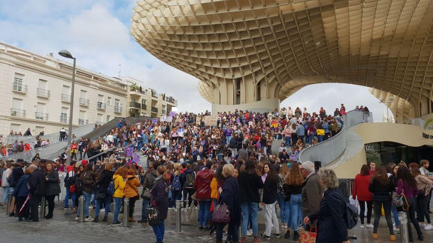 Una tras otra, las ciudades han ido repitiendo el patrón festivo y reivindicativo. Las estudiantes barcelonesas se han citado para abarrotar la vía Laietana e ir avanzando hasta alcanzar la plaza de Sant Jaume. Y no era la única marcha de la ciudad que ha distribuido sus acciones por los barrios. Y, al otro lado de la península, en Sevilla, centenares de jóvenes han caminado al mismo tiempo desde las célebres setas de la plaza de la Encarnación hasta el Parlamento andaluz.