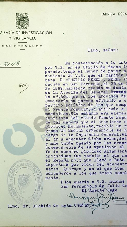 Los documentos descubiertos por el propio investigador, y hasta ahora inéditos, confirman la causa contra estos militares. “En los archivos de esta Comisaría no parece (sic) afiliado a ningún partido político de los que componían el funesto Frente Popular”, dice sobre Virgilio Pérez los informes firmados entre junio y agosto del 41 por el capitán de Fragata e Inspector Jefe de Investigación y Vigilancia de San Fernando, José García de Lomas.