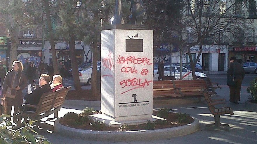 La sección de Espacios Urbanos de la Junta Municipal no sabe nada del “nostrolito”, ni dónde está ni qué sucederá con él. Los vecinos están preparando cartas para pedir explicaciones a la administración local. Ya son dos las pintadas que han aparecido en la base de la escultura del símbolo madrileño. La primera fueron varias guillotinas, en referencia a las protestas por los recortes. La segunda era más explícita: “La Prospe odia a Botella”.