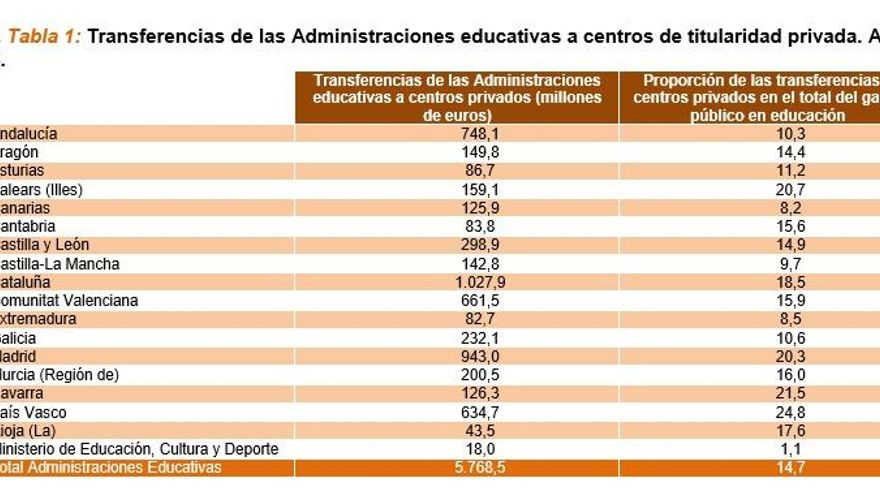 De las cifras recogidas por Educación, llama la atención la distribución de la inversión en comunidades como Madrid, la última en cantidad invertida por alumno de la pública pero en las primeras posiciones –solo por detrás de Euskadi, Navarra y Baleares– en presupuesto dedicado a la educación concertada: fueron 943 millones de euros en 2014, uno de cada cinco euros del gasto total en educación (20%). La media está en un 14,7%.