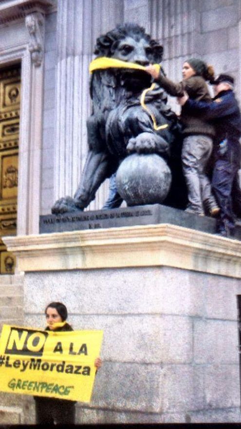 Miembros de la organización ecologista Greenpeace han amordazado esta mañana a los leones del Congreso en una acción de protesta contra la nueva Ley de Seguridad Ciudadana. Dos de los activistas, que portaban cartales con el lema “No a la #leymordaza”, han sido conducidos a comisaría tras la protesta.