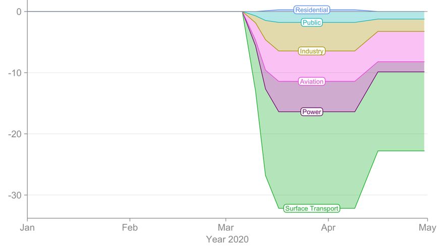 El estudio calcula que la aviación ha paralizado un 75% de su actividad normal, el transporte en superficie cayó a la mitad y la generación de energía un 15%. Mientras, en las casas la actividad creció un poco, hasta el 5%. A partir de ahí, el consumo de energía de cada actividad ha marcado cuánta cantidad de CO ha estado enviando.