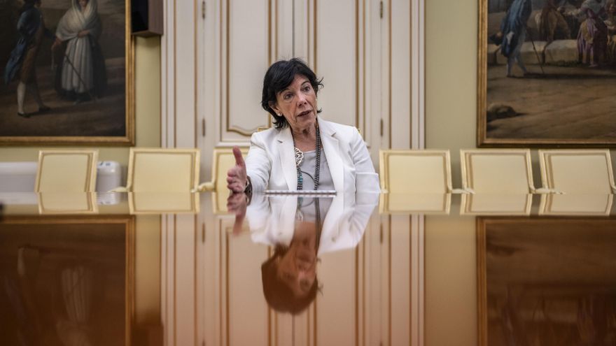 Sin el ajetreo habitual de funcionarios, políticos y técnicos los pasos resuenan en las enormes estancias vacías del palacete sede del Ministerio de Educación en la calle Alcalá de Madrid. La ministra de Educación, Isabel Celaá, atiende a eldiario.es en la sala Goya, donde realiza estos días las videoconferencias con los consejeros de Educación de las comunidades autónomas.