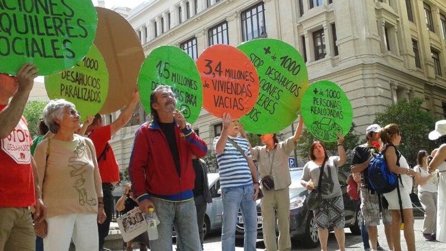 A las puertas de la sede municipal –el Palacio de Telecomunicaciones– la PAH ha realizado un escrache especialmente centrado en la Empresa Municipal de la Vivienda que busca deshacerse de inquilinos de hogares sociales para poder vender las casas a buen precio. La EMVS ya ha vendido miles de esos pisos de protección oficial a fondos de inversión. Además, este jueves se cumple un año de la débil ley antidesahucio. El Fondo Social de Viviendas que se anunció entonces con bombo y platillos (y casi con lágrimas de la vicepresidenta del Gobierno, Soraya Sáenz de Santamaría) es un rotundo fracaso: de los 6.000 pisos disponibles sólo se han entregado 410.
