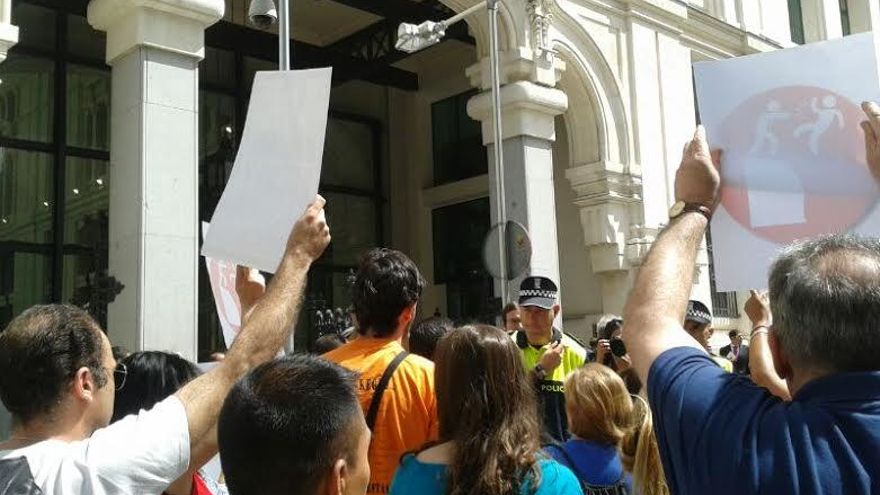 “Se están devorando nuestro dinero ahí dentro”, proseguían los escrachadores. Transcurridos treinta minutos, ha comenzado a aparecer una furgoneta tras otra de antidisturbios para disolver la concentración. En el proceso de despeje de la calle, se han vivido algunos momentos de tensión, gritos y empujones. Una de las manifestantes ha sido llevada por los agentes a una de las furgonetas mientras se acordonaba el acceso al Ayuntamiento con una hilera de agentes.