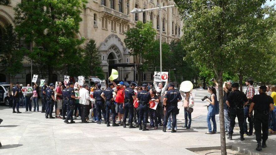 Seis furgones de la Policía Nacional y dos de la Unidad de Intervención de la Policía Municipal se habían desplegado para rodear al grupo –que no superaba las 80 personas– para alejarlo de la puerta del palacio municipal, que costó a las arcas madrileñas 500 millones de euros. Desierta la calle de Montalbán, donde se encuentra la entrada principal al palacio, los manifestantes se han ido dispersando por el Paseo del Prado sin mayores altercados.
