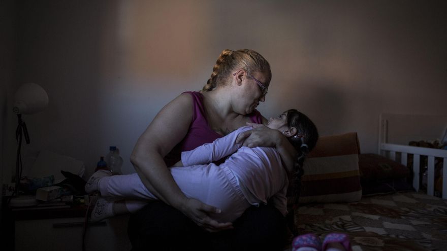 Hoy, Eva está en situación de desempleo, aunque durante los últimos dos años asegura haber conseguido algún trabajo esporádico, en su mayoría por horas. Pero que no ha podido continuar debido a problemas de conciliación a los que se añaden la atención que Yomara necesita, no solo por su corta edad, sino porque la cría padece esclerosis tuberosa y las visitas al hospital son constantes.
