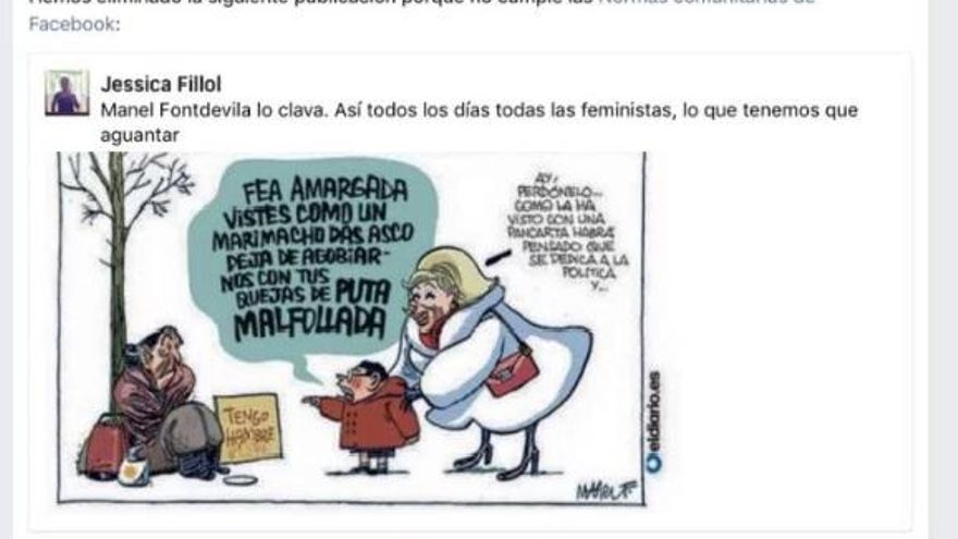 “El lenguaje que incita al odio es una excusa. Tumban las páginas a través de denuncias organizadas”, asegura Jessica Fillol, una de las administradoras de la página, que al subir desde su perfil personal varios de los contenidos ha tenido bloqueada la suya durante días. “Facebook ha llegado a bloquearme un chiste de Manel Fontdevila que señalaba los abusos que recibimos a diario por nuestro activismo”.