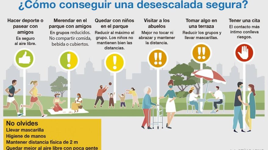 Para limitar el riesgo de nuevos brotes, España ha optado, como otros países, por estrategias de salida escalonadas y progresivas. Estas permiten a las personas tener poco a poco más flexibilidad de movimiento y retomar el contacto con los suyos, pero algunos de estos nuevos escenarios implican más riesgos que otros.