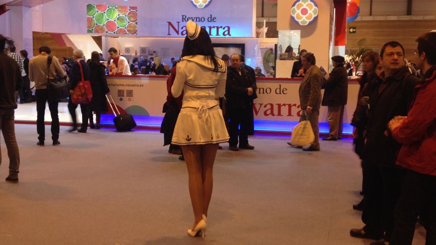Una minifalda y un traje que evoca al de un 'marinero' es la indumentaria que Águilas, de Murcia, ha elegido para las azafatas que reparten los folletos de su oficina de turismo. “Es que este año están centrados en el mar y la pesca”, explica una de las jóvenes, acostumbrada a que le pidan si pueden hacerle una foto. “Contigo me quedaría el resto del día”, le ha dicho un señor a la chica de otro estand, con la que previamente se había fotografiado. Es la tónica habitual en una feria como Fitur, y la presencia de 'mujeres objeto', una realidad a la que la sociedad está acostumbrada.