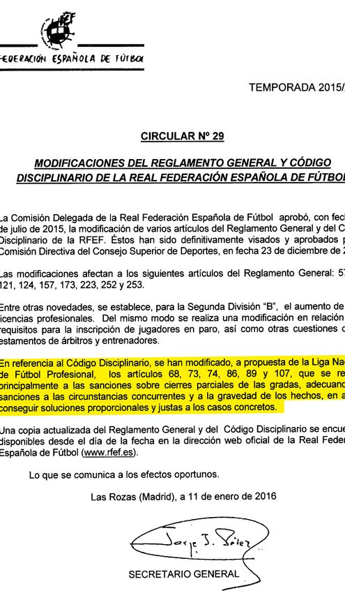 La circular está fechada el 14 de enero de 2015 en Las Rozas (Madrid) -donde está la sede de la Federación- y lleva la firma de su secretario general, Jorge Pérez. Las modificaciones permitían cerrar una grada de un estadio durante cuatro partidos al primer episodio de cánticos racistas.