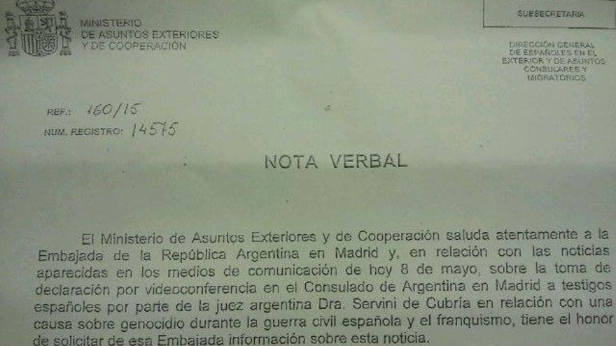 El 8 de mayo, día previsto para que comenzaran las declaraciones por videoconferencia, el Ministerio transmitió al embajador Carlos Bettini el “descontento y malestar” del Gobierno español por el procedimiento –aún cuando la comunicación se estableciera en territorio argentino– y pidió que las diligencias se realizaran solicitando una comisión rogatoria, “tal como prevé el Tratado bilateral de asistencia judicial”.