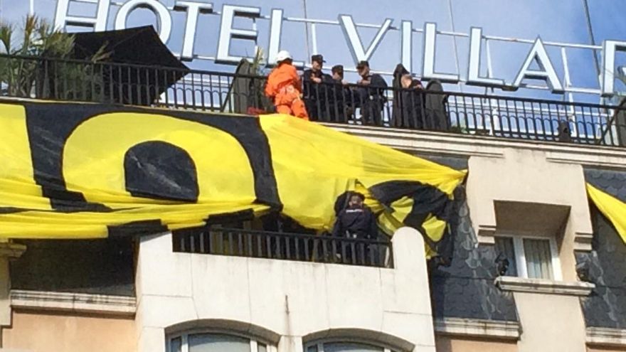 Un grupo de escaladores de Greenpeace han descolgado a medias una pancarta contra la ley de Seguridad Ciudadana que se vota este jueves en el Congreso. La policía ha cortado parte de la tela que rezaba: “No a la ley mordaza”.
