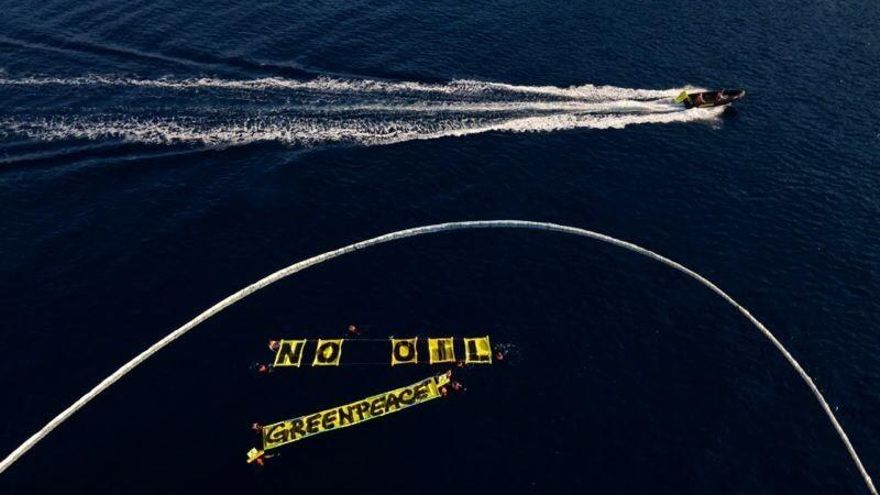 Según ha informado Greenpeace, a primera hora de la mañana un grupo de los activistas que viajan a bordo de su buque Rainbow Warrior ha extendido sobre el agua una línea de boyas de contención de vertidos de 100 metros de longitud.
