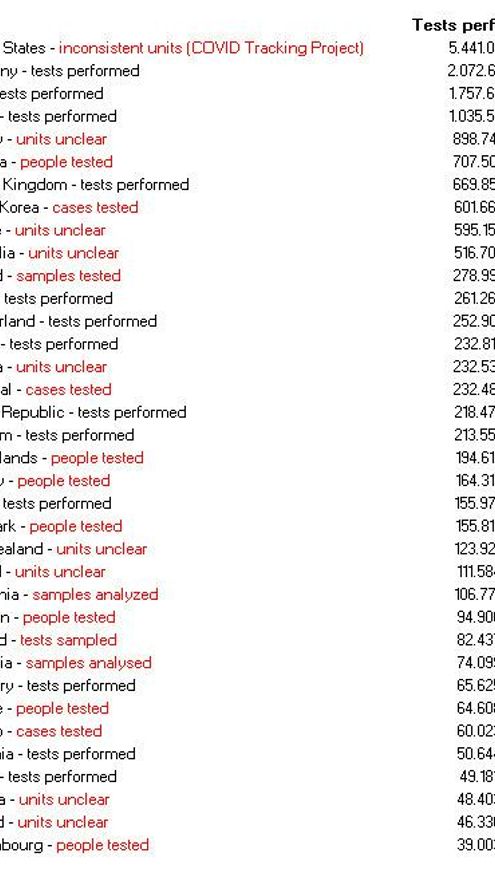 De Croacia, por ejemplo, se afirma: “No está claro si las cifras facilitadas incluyen pruebas para las cuales los resultados están pendientes”. En el caso de Luxemburgo, se explica: “Proporciona una actualización diaria de las pruebas realizadas desde el comienzo de la crisis. El número de personas que dieron positivo se informa como una cifra separada, lo que puede sugerir que pruebas realizadas puede referirse al número de personas evaluadas”.