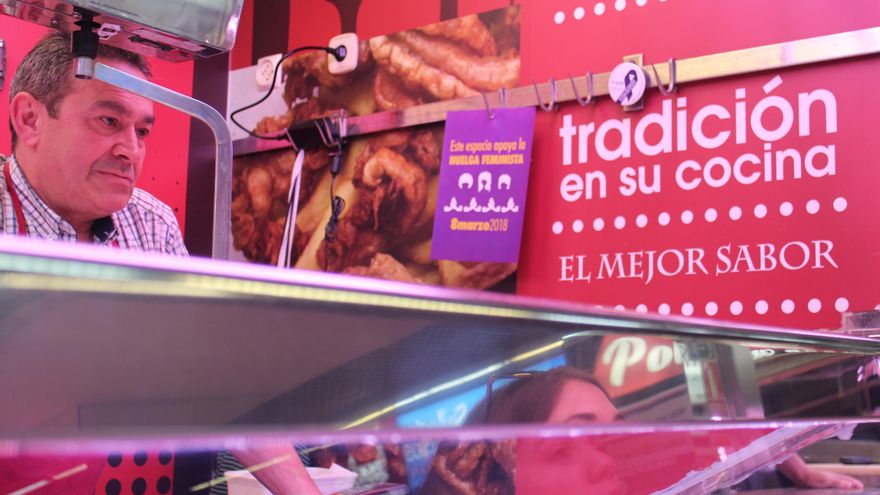 “La recepción, sobre todo por parte de las mujeres, está siendo buena. Los hombres en general amables, pero no demasiado abiertos”, opina una de las organizadoras de la acción en Arganzuela. Ahora están recorriendo los establecimientos de dentro del mercado informando a los y las encargadas de los mismos. Les animan a colgar el cartel que anuncia la huelga, a difundir la convocatoria y a encargarse de las tareas de cuidado. “Es algo que poco a poco estamos intentando”, dice un hombre mientras coloca el cartel en la pared de su charcutería.