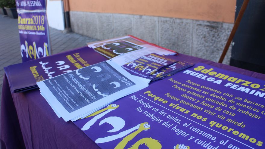 El plan está claro: repartir octavillas, conseguir la atención de las mujeres que hacen la compra en el mercadillo de La Elipa y explicarles que el próximo 8 de marzo es el Día Internacional de la Mujer y que están llamadas a hacer huelga laboral, de consumo, de cuidados y educativa. Muchas miran con extrañeza, pero cuando las organizadoras consiguen hilar tres frases y las compradoras se dan cuenta de que están hablando del desequilibrio de sus vidas cotidianas, ellas mismas lo reconocen: “Pues es verdad, sin nosotras, se para el mundo”.