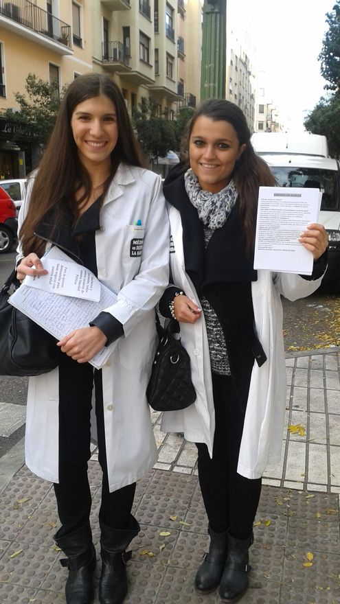 Pues, al menos en el caso del Gregorio Marañón, muchos en los alrededores del edificio explicando las movilizciones y pidiendo firmas a los vecinos. Emilia y Silke son dos estudiantes de 4º de medicina. Por lo tanto, ya hacen parte de sus estudios y prácticas en el hospital. “Hoy no hacemos las prácticas por los paros así que hemos decidido salir a la calle para pedir apoyo a los ciudadanos”, cuenta. Están apostadas en la confluencia de las calles de Alcalá y Narváez, dos ejes importantes de la zona. “En una hora y media hemos recogido más de 120 firmas”, cuentan contentas. Dicen que decidieron colaborar “para ayudar a los adjuntos y a nuestro propio futuro” al tiempo que se quejan del vídeo que la Consejería de Sanidad ha difundido para defender sus medidas. “Ha venido una señora que nos ha llamado vagos, que lo que no queremos es que nos controlen y que nos van a echar a todos, pero por lo demás bien”, explican un poco entre risas. “Nos firman muchas veces sin querer que les contemos todo el rollo, dicen que ya lo saben”.