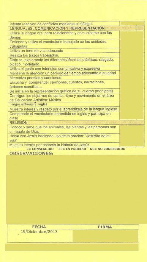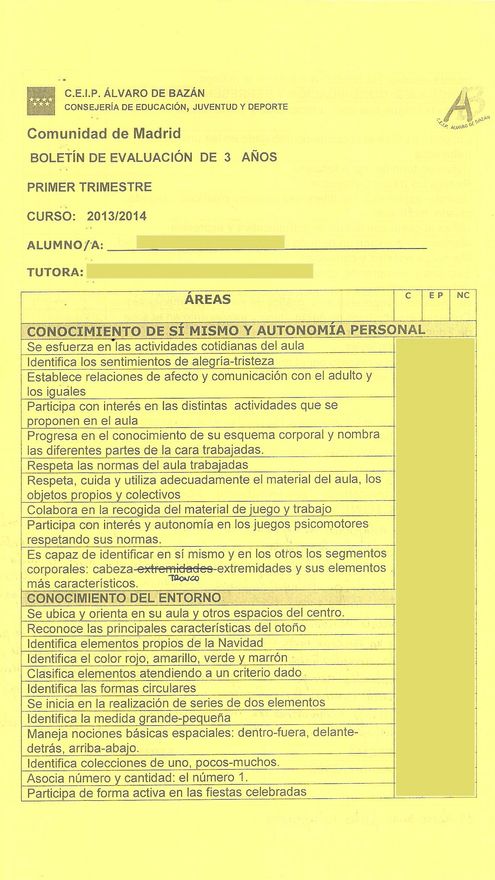 La directora del centro ha explicado a eldiario.es que los criterios de evaluación de Religión Católica los elaboran los profesores, y que están incluidos en el boletín de notas porque se trata de una asignatura de oferta obligatoria. En realidad Religión no es de oferta obligatoria en Infantil, aunque sí lo es en Primaria y ESO. Los docentes reciben su sueldo de las arcas públicas -con un coste que se calcula en 500 millones de euros al año-, pero el currículo de esta materia está establecido únicamente por la Conferencia Episcopal (CE).