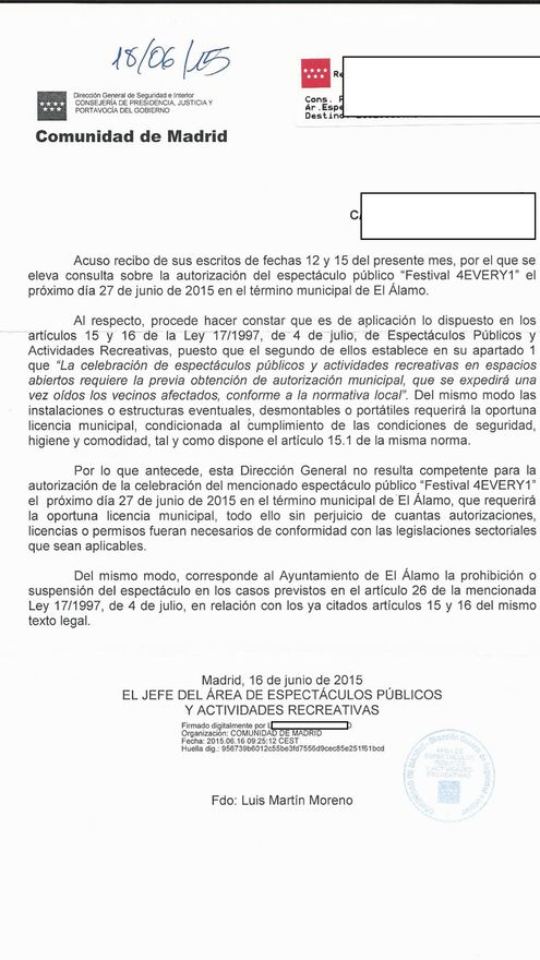 El cuadro lo ha completado otro de los departamentos del Gobierno regional: la Consejería de Presidencia. Su área de Espectáculos Públicos y Actividades Recreativas se ha desentendido del problema que se está generando con un festival anunciado y con miles de entradas ya vendidas (según cuenta la organización) al que le falta el visto bueno medioambiental. En un escrito al que ha tenido acceso eldiario.es, este departamento asegura que “no es competente para la autorización de la celebración del mencionado espectáculo público FESTIVAL 4EVERY1”. El escrito argumenta que los eventos “en espacios abiertos requieren (...) la autorización municipal”. Y remiten, específicamente, al Ayuntamiento de El Álamo como responsable de la “prohibición o suspensión” del espectáculo. Justo el Ayuntamiento que ha ido de la mano de los promotores para montar el festival y que contestó a este medio que “todo está O.K.”