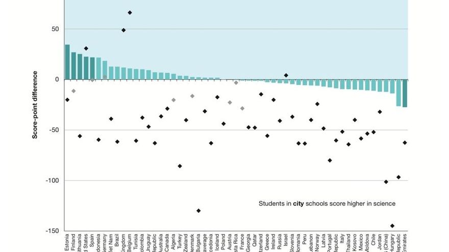 El único país de la OCDE donde los resultados rurales son significativamente peores que los urbanos es Emiratos Árabes. Si no se tiene en cuenta el índice socioeconómico y cultural del alumnado y del centro donde estudia, los estudiantes rurales obtendrían mejores resultados que los urbanos en Bélgica, Reino Unido, Estados Unidos, Israel y Alemania.