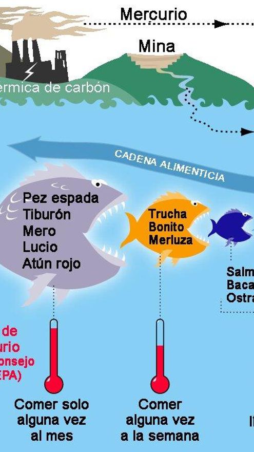 El diagrama muestra la penetración del mercurio en la cadena alimenticia marina con los niveles que acumulan los distintos tipos de peces y las recomendaciones de la Agencia de Protección Medioambiental de Estados Unidos (USEPA) sobre sus cantidades de consumo aconsejables.