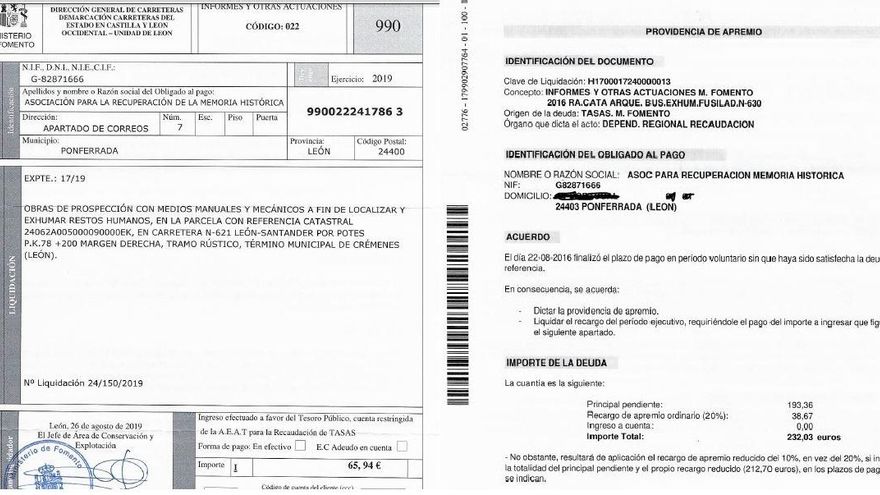 Los dos recibos parten de la Dirección General de Carreteras y en concreto de la Demarcación de Carreteras del Estado en Castilla y León Occidental (Unidad de Carreteras en León) y especifican como concepto “las obras de prospección con medios manuales y mecánicos a fin de localizar y exhumar restos humanos”. Desde la ARMH muestran su “desconcierto” y apuntan a la “arbitrariedad” en la decisión. “Hemos pedido la misma autorización otras veces y no nos han cobrado la tasa”, dice Marco Antonio González. “No entendemos, además, en base a qué en un proyecto nos cobran 60 euros y en otro 190”.
