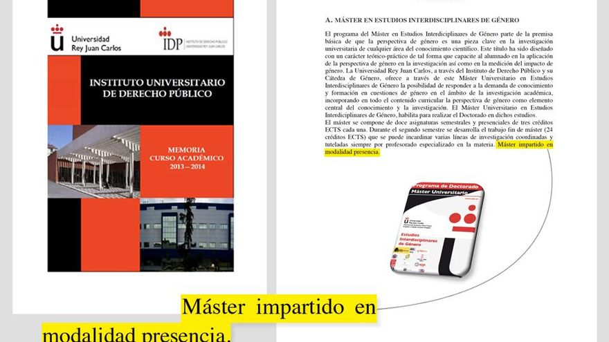 Sin embargo, la información oficial del máster que aprobó en la Universidad Rey Juan Carlos desmiente esta explicación. El título en cuestión, un posgrado titulado 'Máster en Estudios Interdisciplinares de Género', legalmente no se podía realizar “a distancia”, como sí ocurre con otros títulos habilitados para ello. Era exclusivamente presencial.